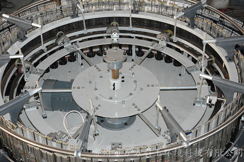 圓織機的經紗架上有有許多紗錠,依據編織布幅寬和扁絲寬度,使用規定范圍數量的經紗.經紗進入圓織機前,由經紗的棕框對經紗進行交叉開口,緯紗梭子在交叉開口中作圓周運動穿過經紗,編織成筒布. 一臺圓織機有幾把梭子,就有幾條緯紗同時織入.對于平織布,可用平織機,片梭織機,噴水織機編織.
